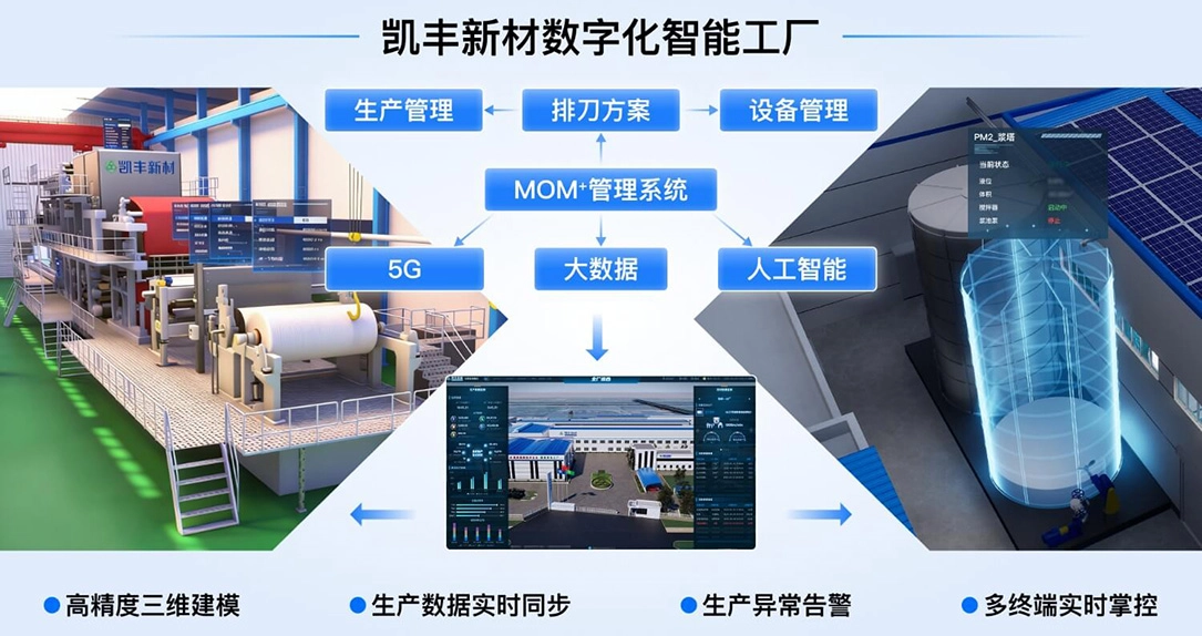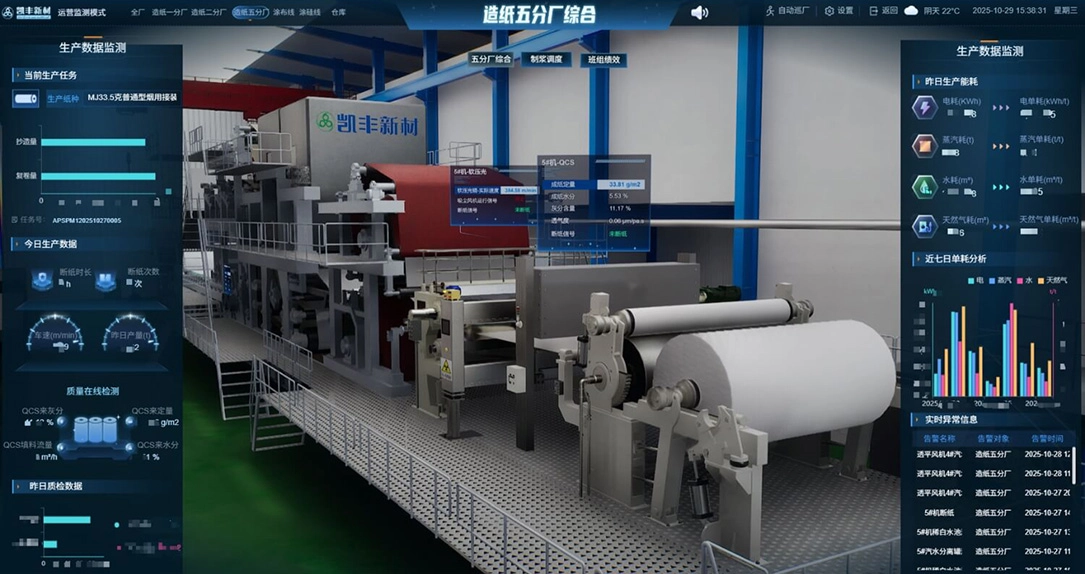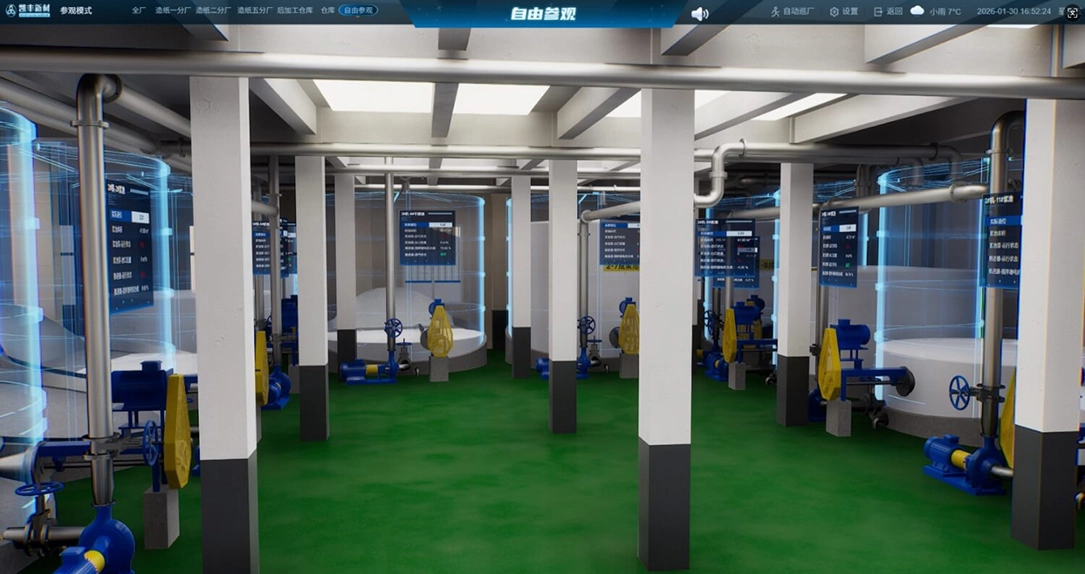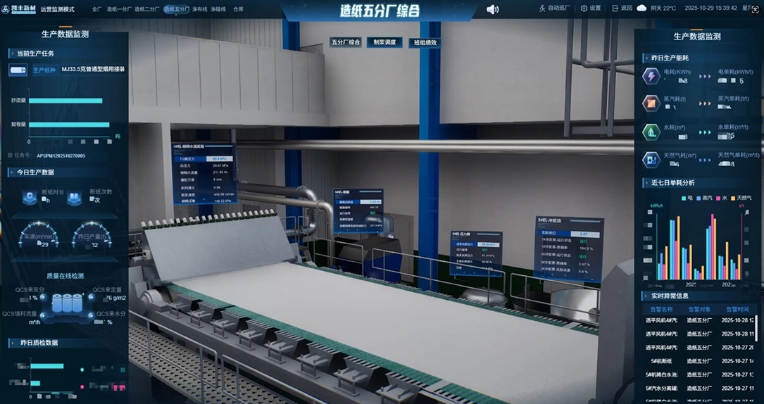 Through high-precision 3D modeling, real-time IoT(Internet of Things) data collection, and big data analytic, the company enables real-time synchronization between the physical production site and the virtual factory. Key information such as equipment status, pulp tank capacity, paper machine speed, production line inventory, and abnormal alerts is dynamically displayed, creating a visual, controllable, and intelligent production management system.